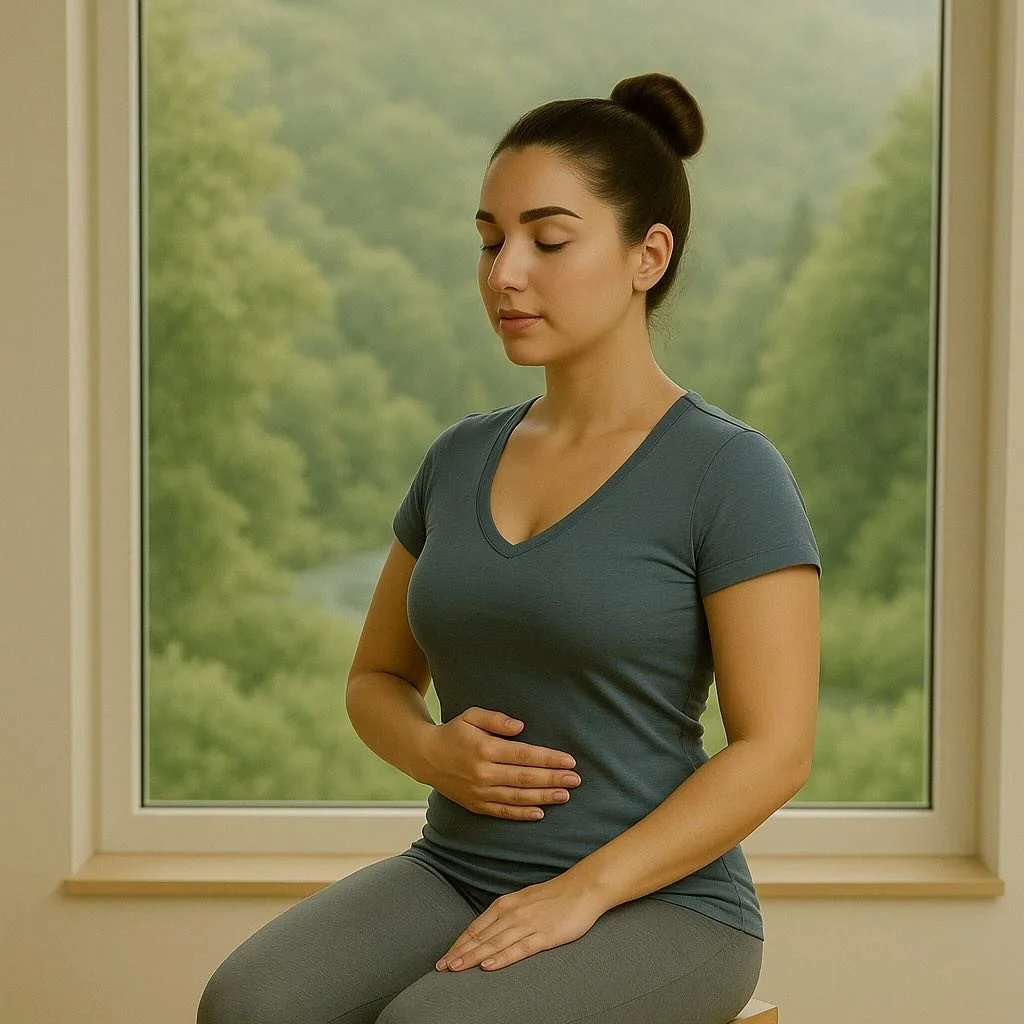Diese Übung unterstützt eine vertiefte, natürliche Atmung über die Aktivierung des Zwerchfells. Durch sanfte Berührung im Bereich des Oberbauchs lässt sich die Atmung bewusst in den Bauchraum lenken.